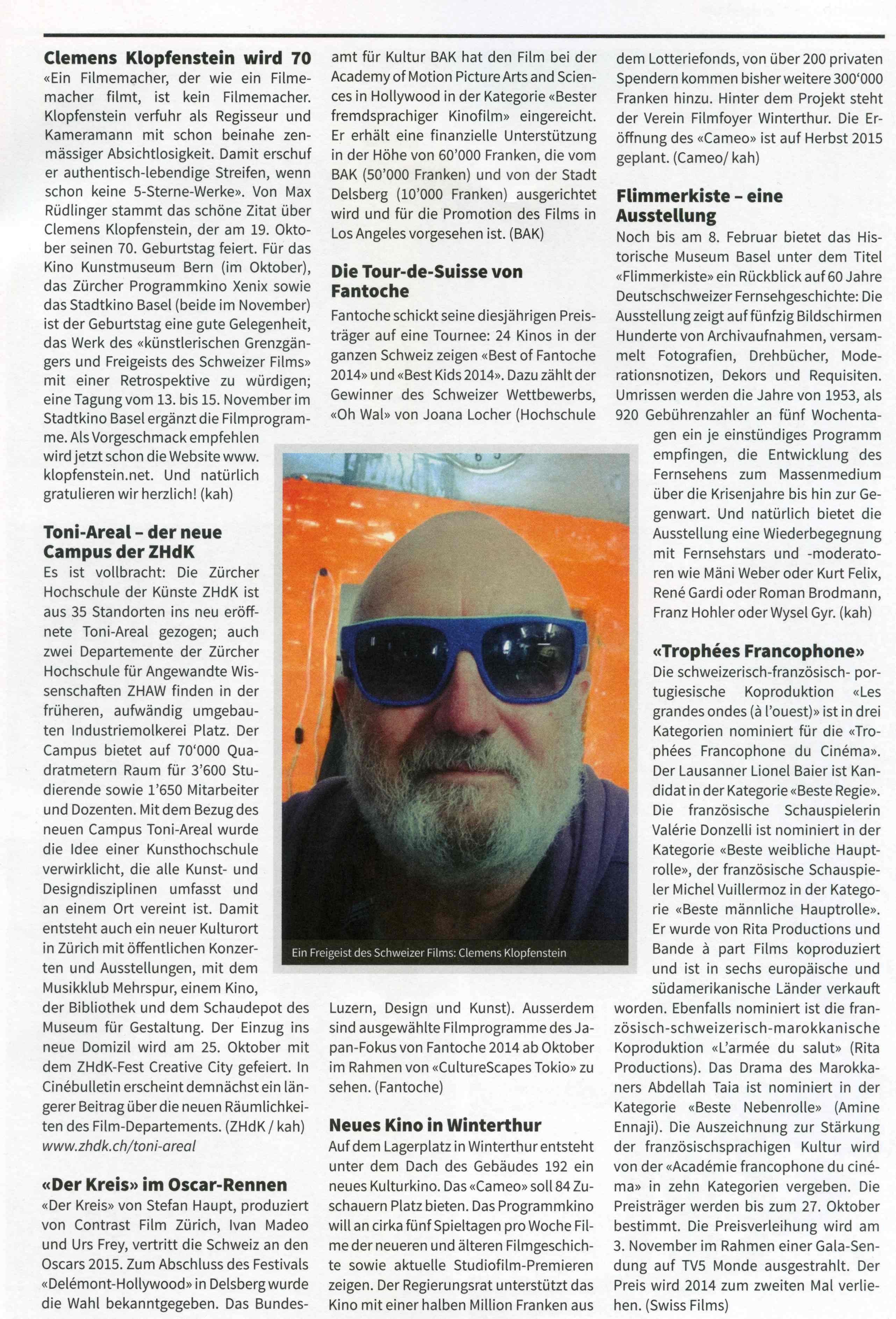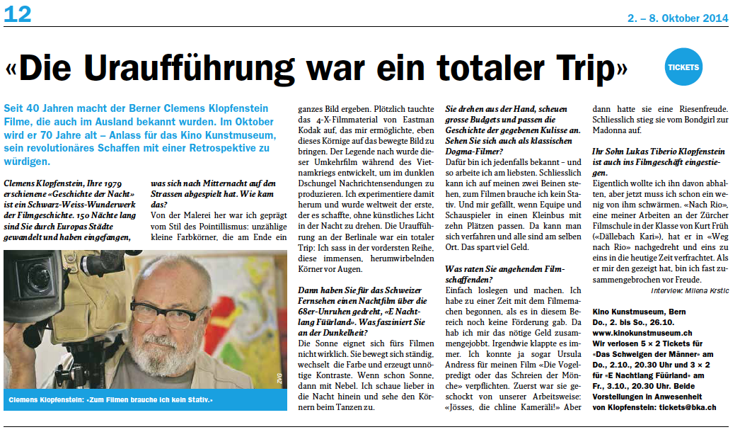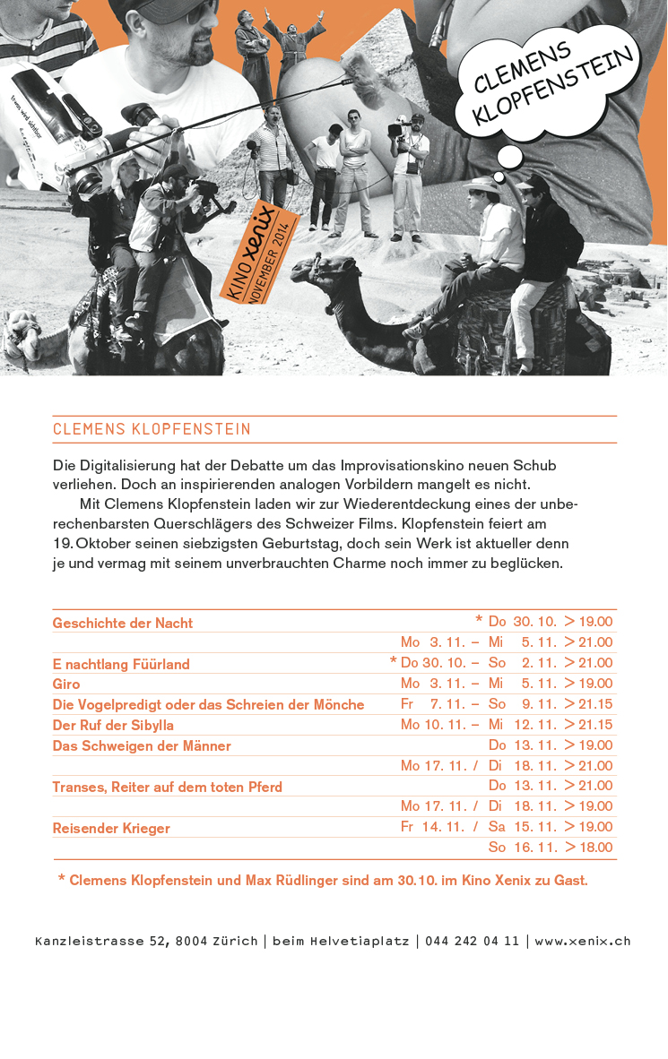 Das “Symposium für Klopfenstein”, von Uni Basel, eikones und Stadtkino Basel organisiert, war ein voller Erfolg, in Bälde werden hier die Vorträge von Professorin Christine Noll Brinckmann, von Professor Wolfram Groddeck sowie von Johannes Binotto und Hansmartin Siegrist einsichtbar sein. Die Vorträge von Professorin Ute Holl, von Professor Vinzenz Hediger werden in einem speziellen Buch 2015 erscheinen.