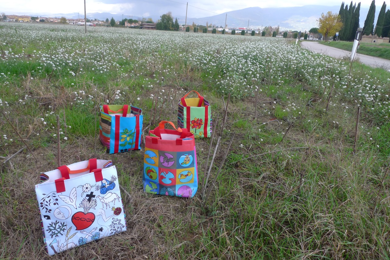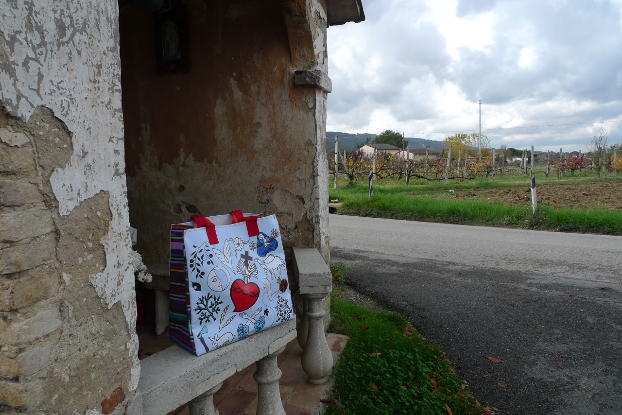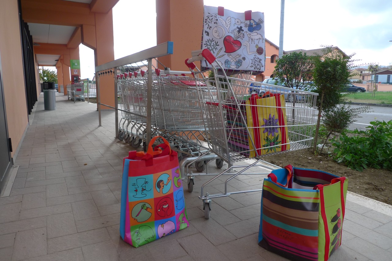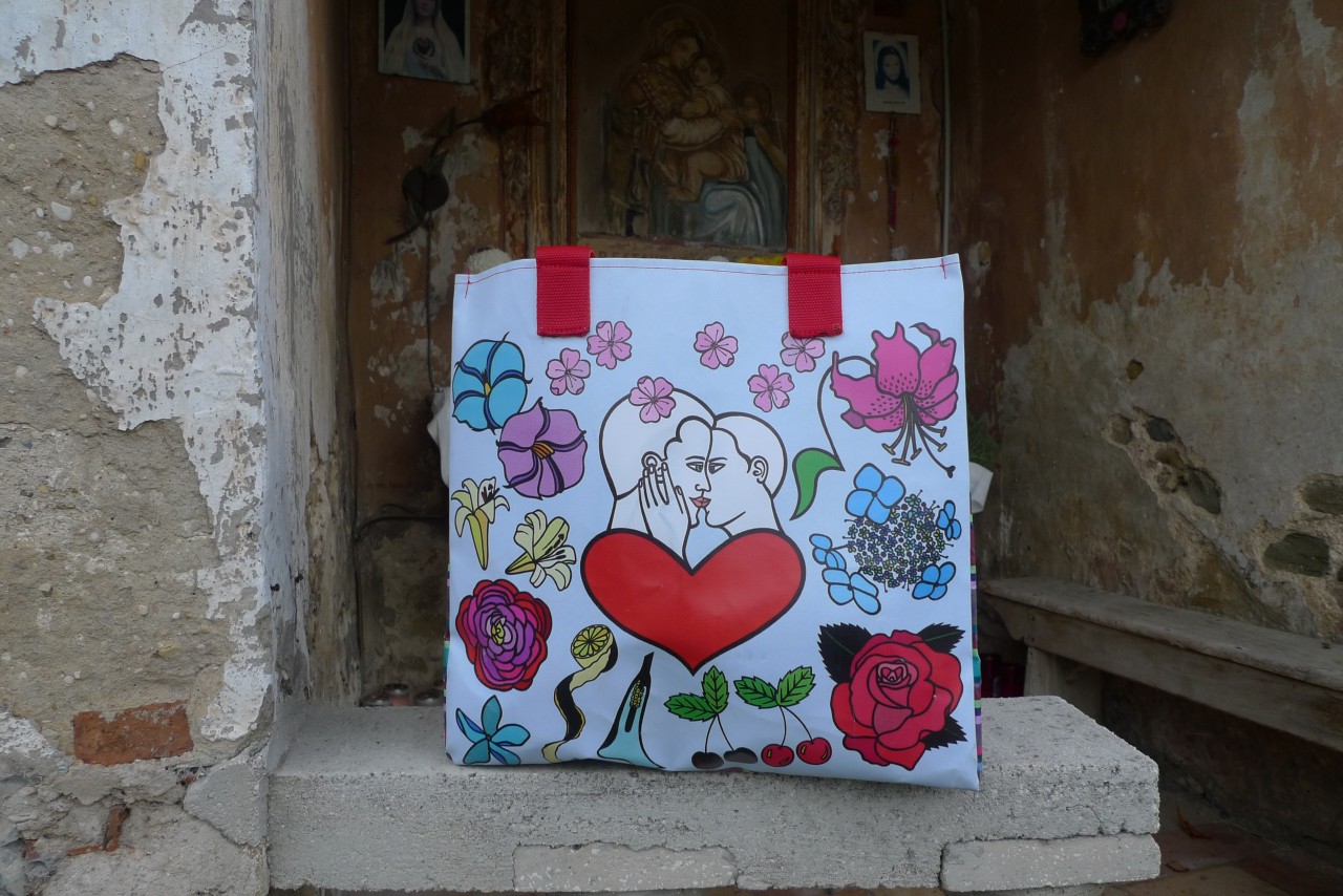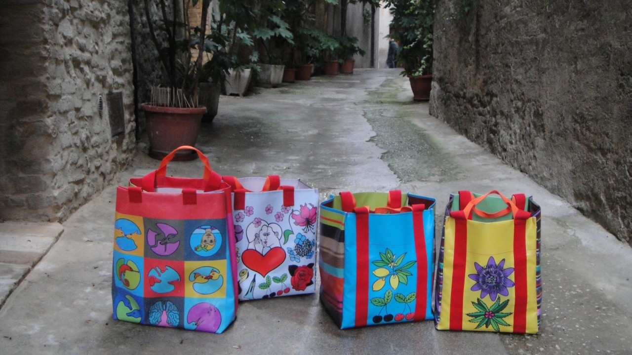 Flowers, plants — heart and sorrow — circles filled with everyday occurrences — those are the themes of the 4 new shopper bags made of printed PVC. The stripes on the sides are colored following the scheme of the “Befana” and “Sibylla” scarves. The bags are waterproof and have both long and short shoulder handles.