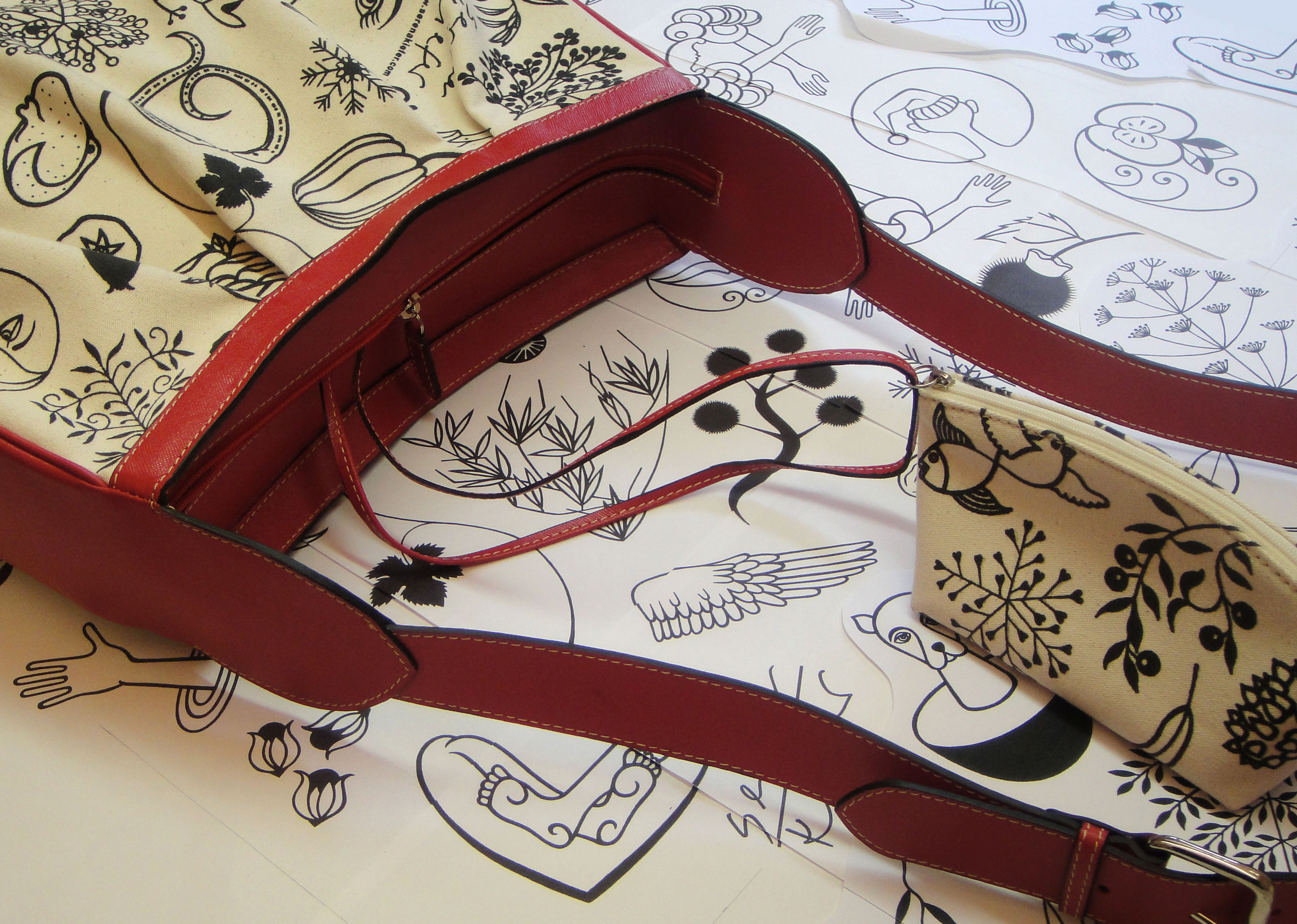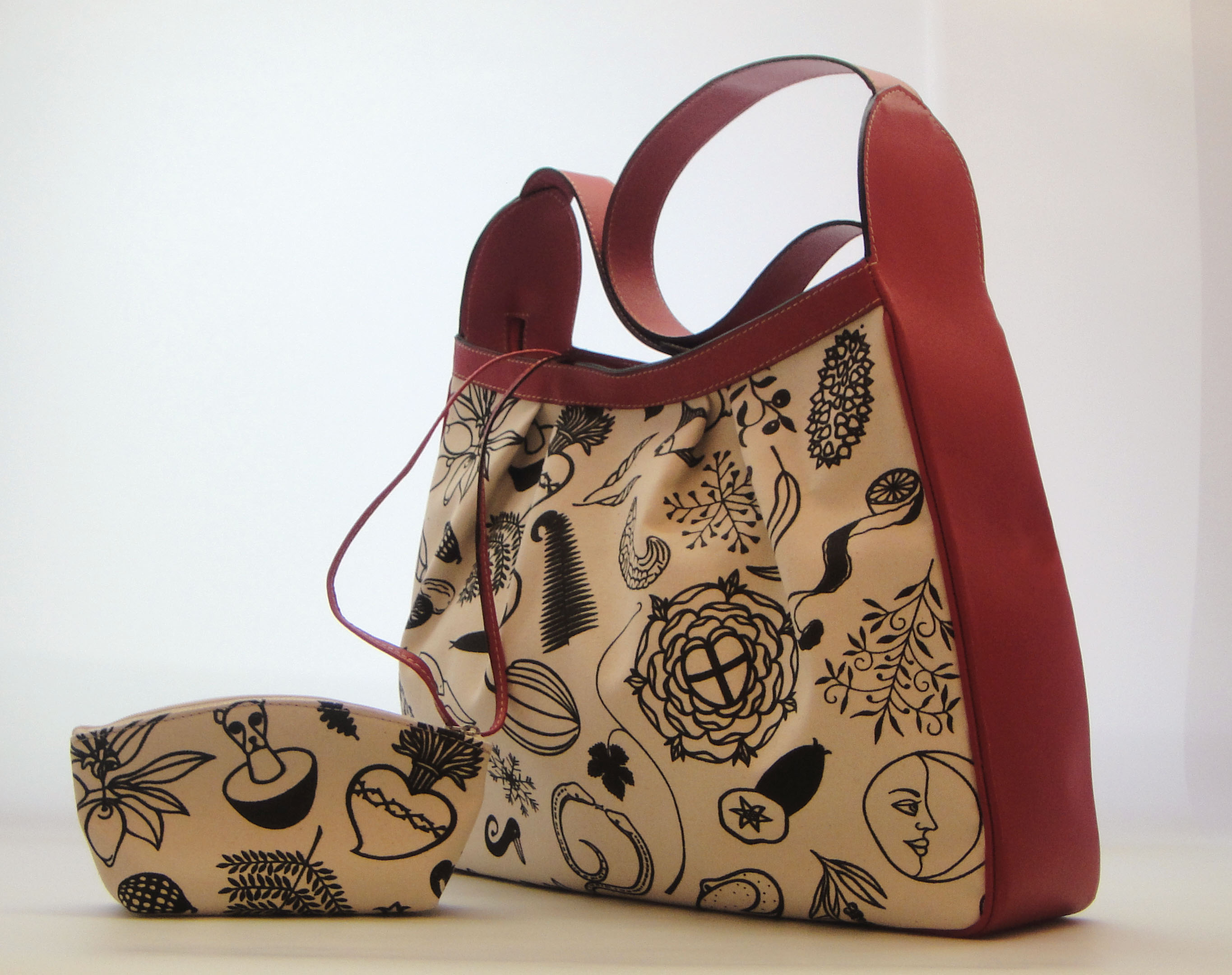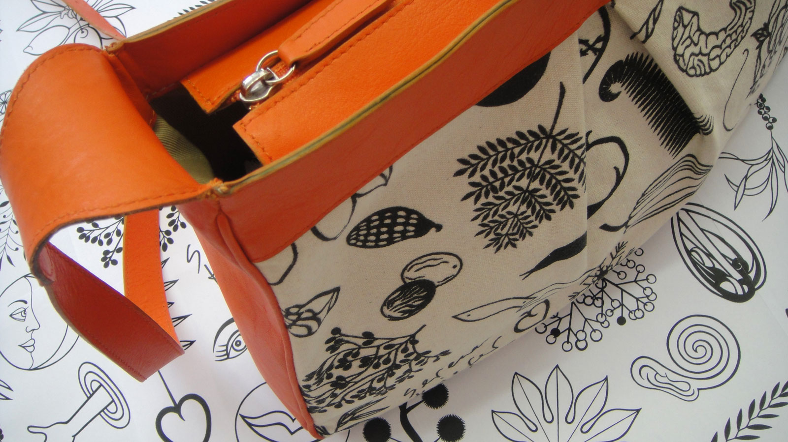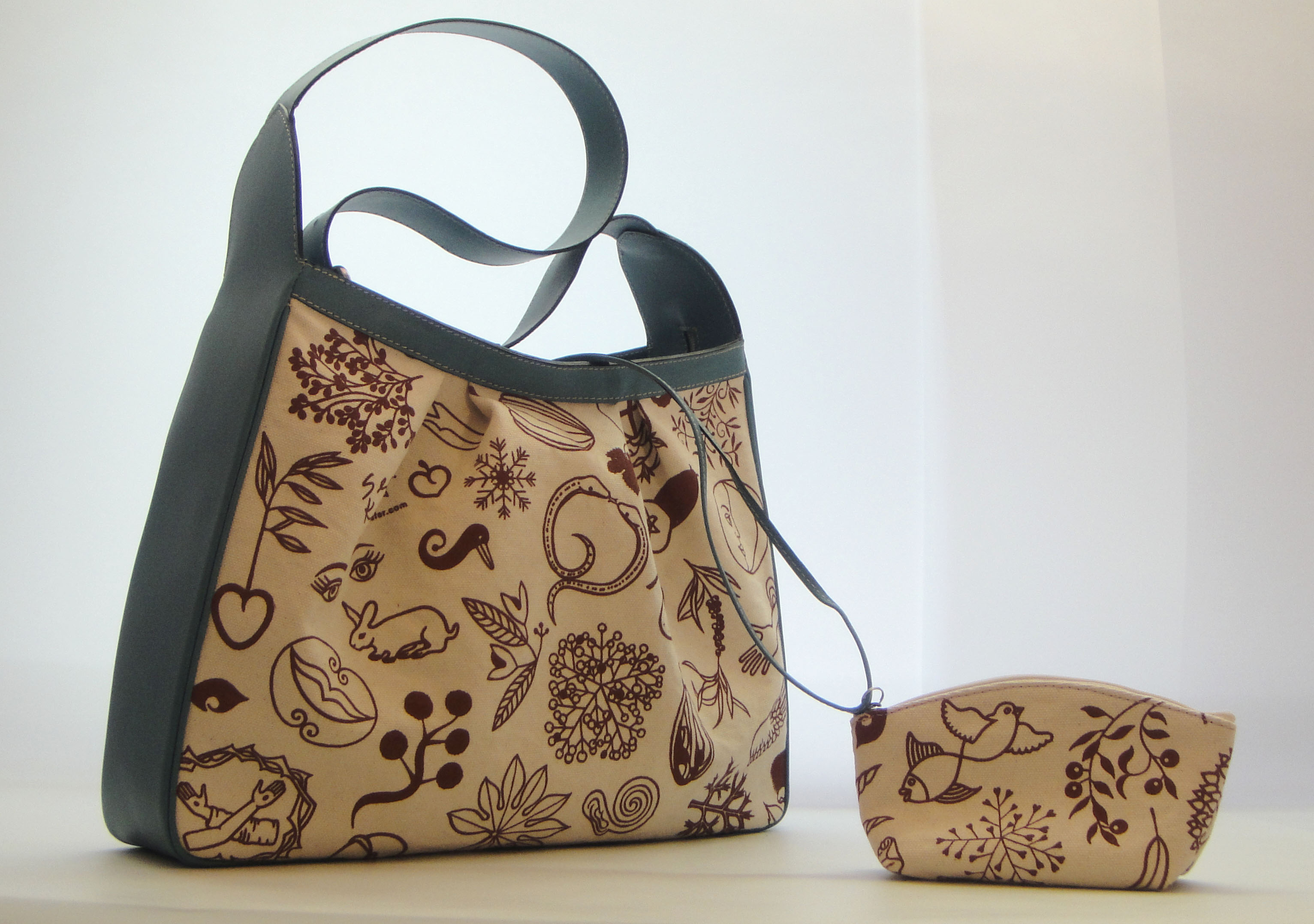 Der Prototyp meines ersten Taschenmodells ist da — von professioneller Hand in einer italienischen Lederwaren Firma in Florenz genäht. Ein fester Baumwollstoff, mit meinen Motiven bedruckt als Blickfang, mit Leder kombiniert.
