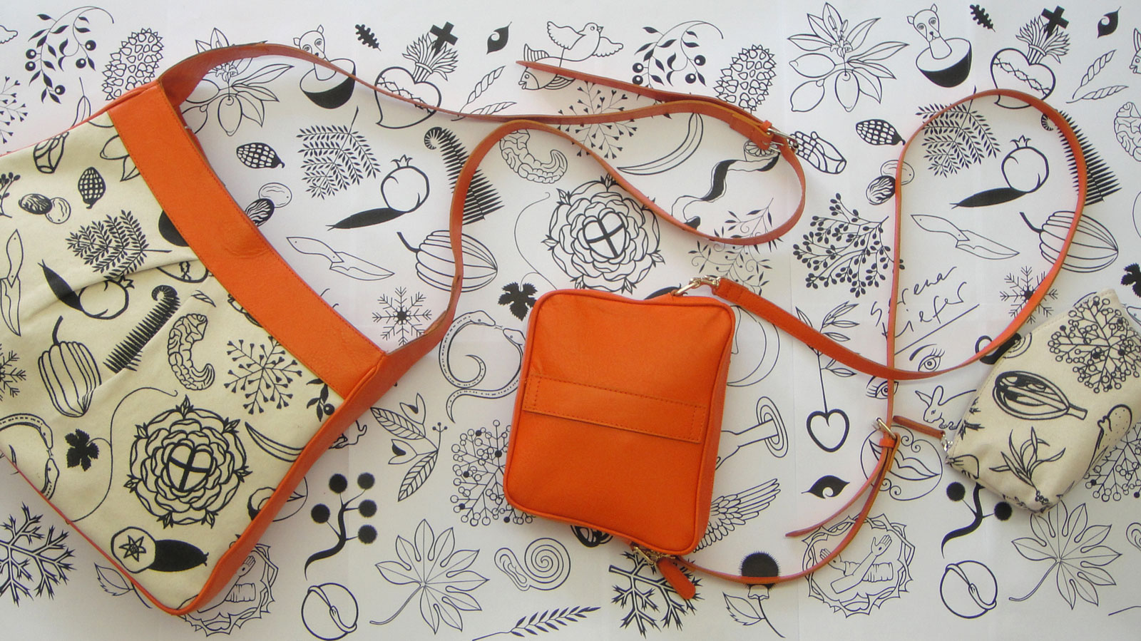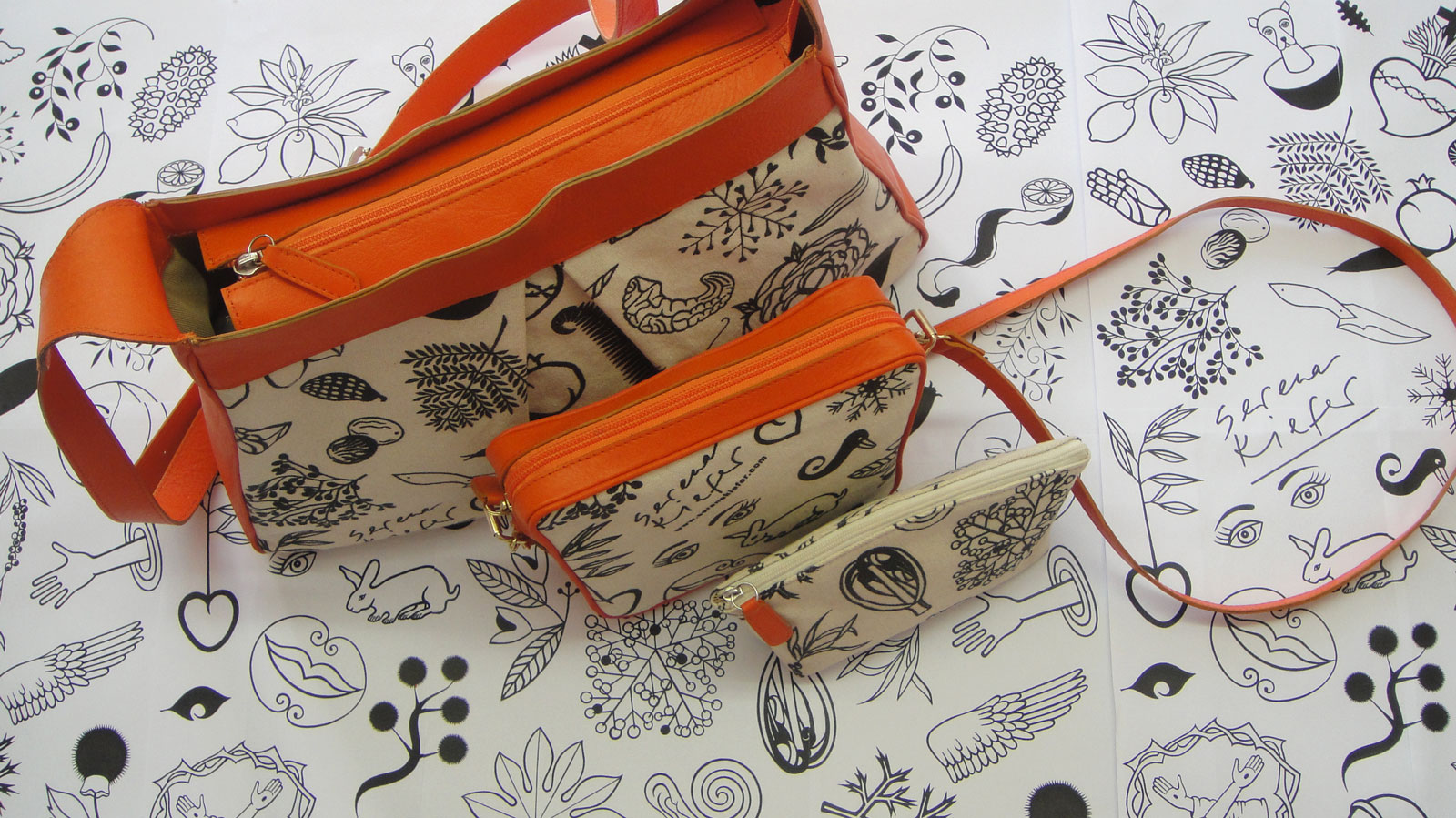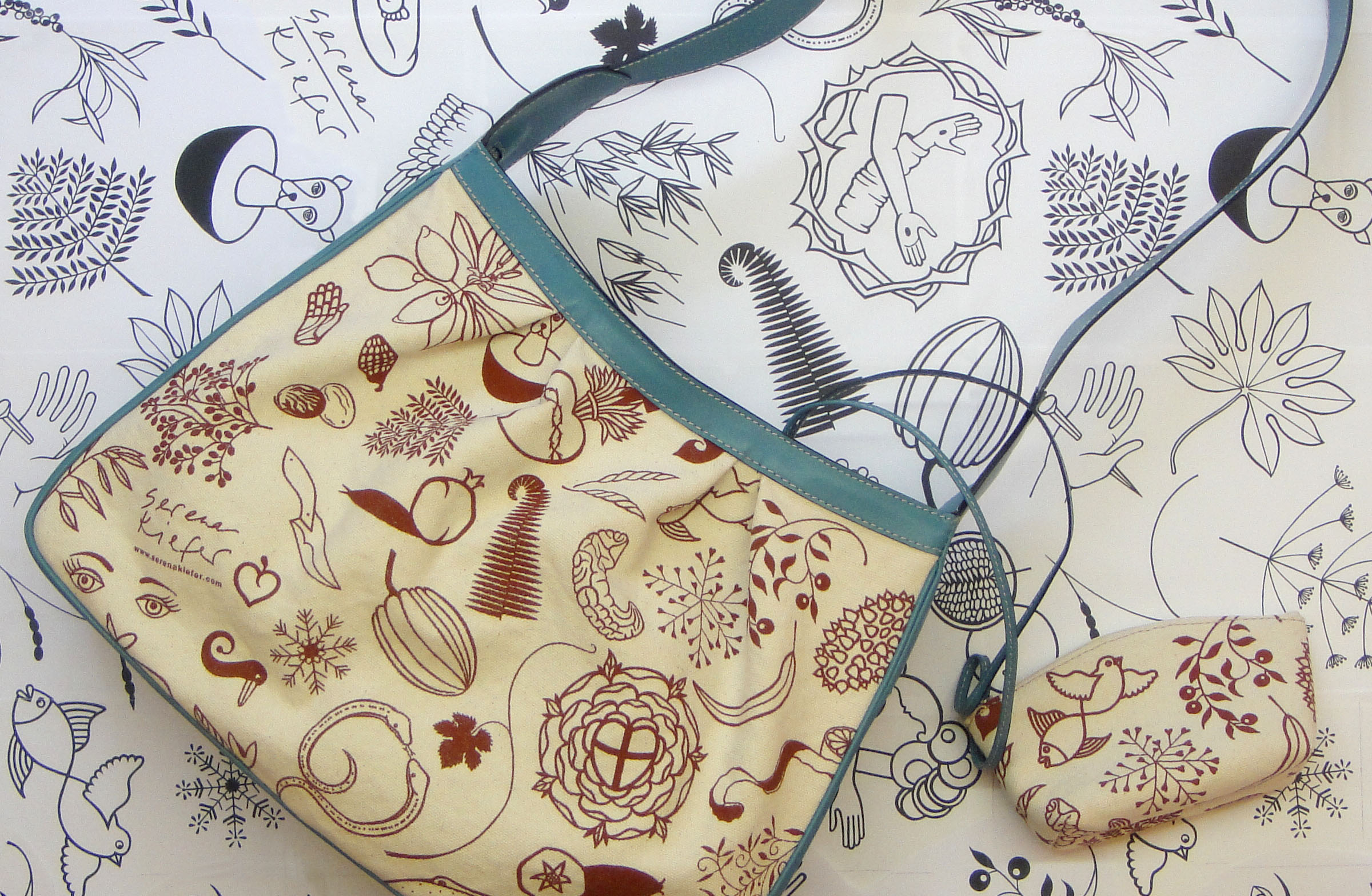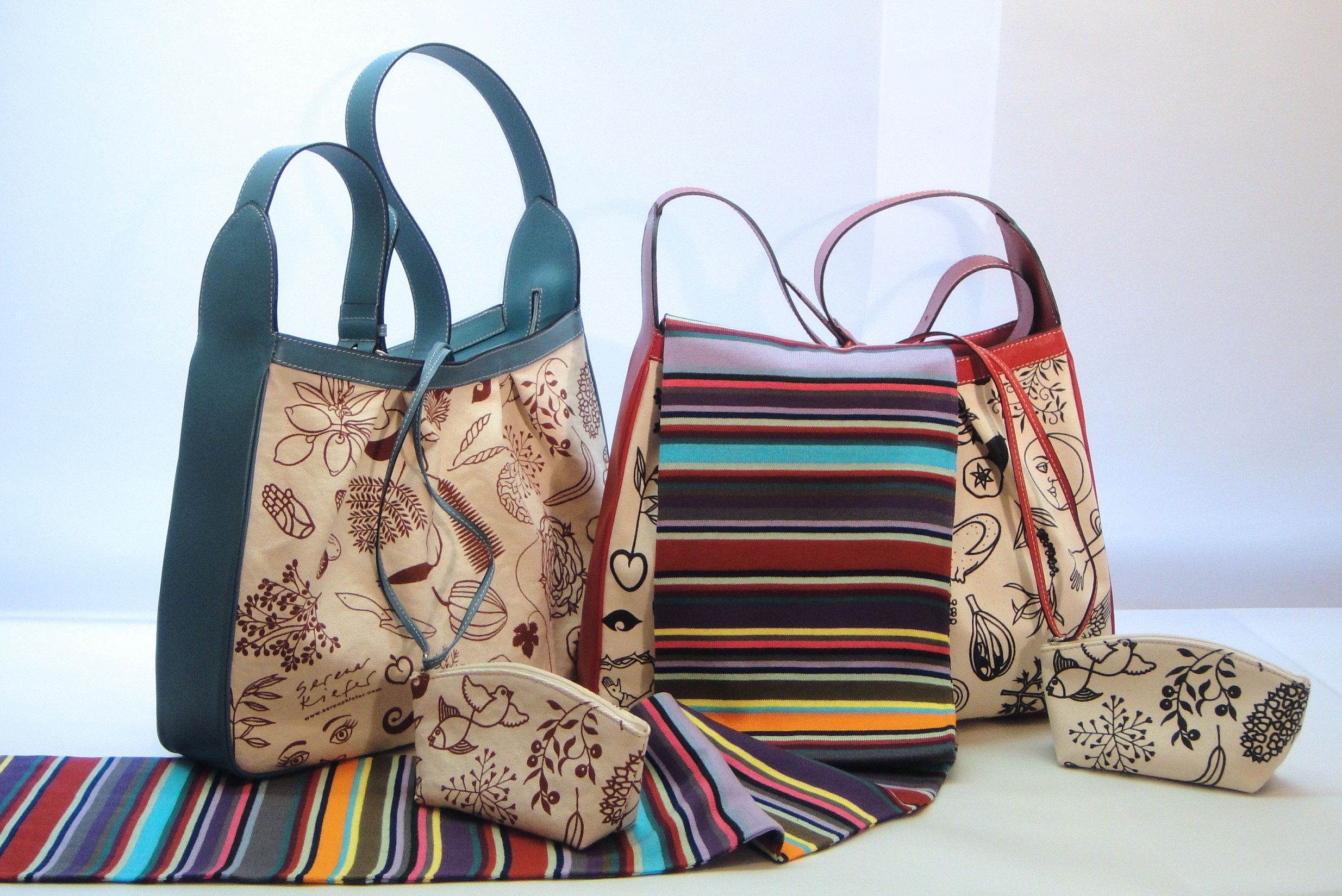 Der Prototyp meines ersten Taschenmodells ist da — von professioneller Hand in einer italienischen Lederwaren Firma in Florenz genäht. Ein fester Baumwollstoff, mit meinen Motiven bedruckt als Blickfang, mit Leder kombiniert.